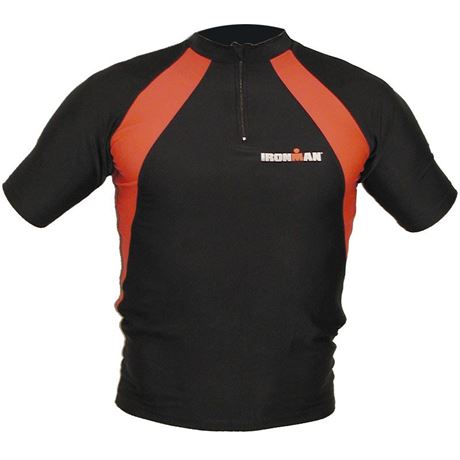 Tight-fitting Ironman Tri Zip Tee for men with Lycra sleeves. Zip closure at the chest. A fabric placket protects the skin from rubbing during the zipper. Two small pockets on the back for storing utensils or food.