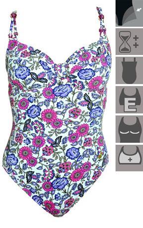 Bathing suit cream white with wired cups E for women and floral pattern (purple and pink).