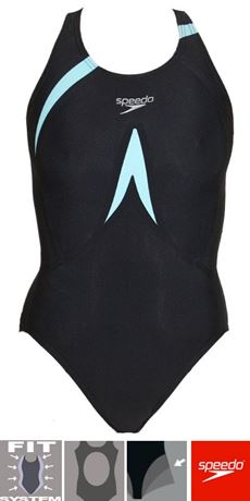 Black sporty swimsuit from Speedo with asymmetrical blue inserts.