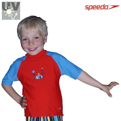 Red Speedo sun protection t-shirt (blue sleeves) with high neck and a longer back protects also when playing
