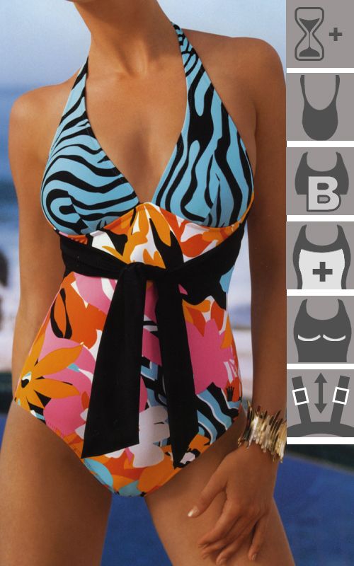 Una imaginativa combinación de estampados en colores brillantes y alegres, combinada con un impresionante diseño de cuello halter, alarga visualmente el cuerpo. La cinta negra cosida en el lateral se puede anudar por delante o por detrás. Un innovador aro de titanio de longitud completa proporciona soporte y forma.